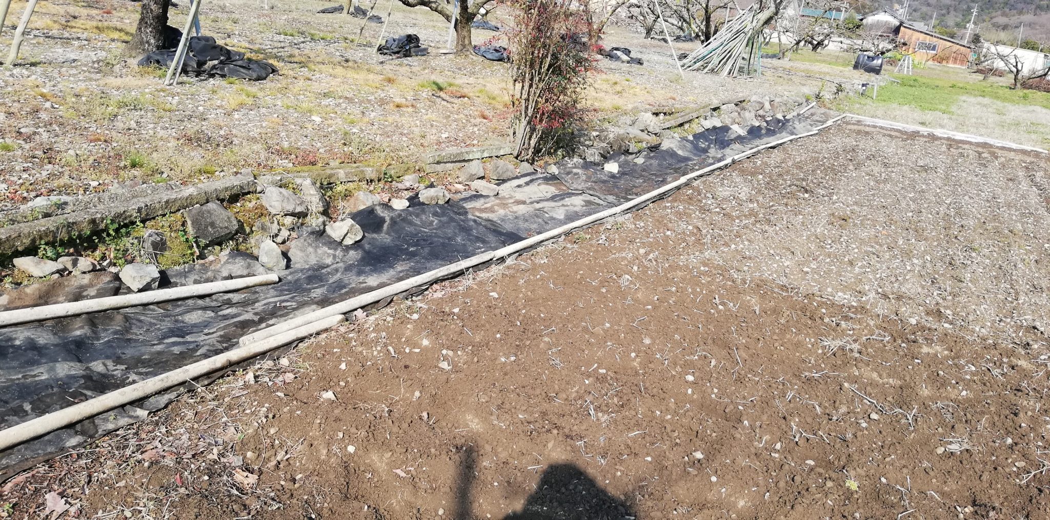 畑の横の除草用のマルチを張りなおしました。