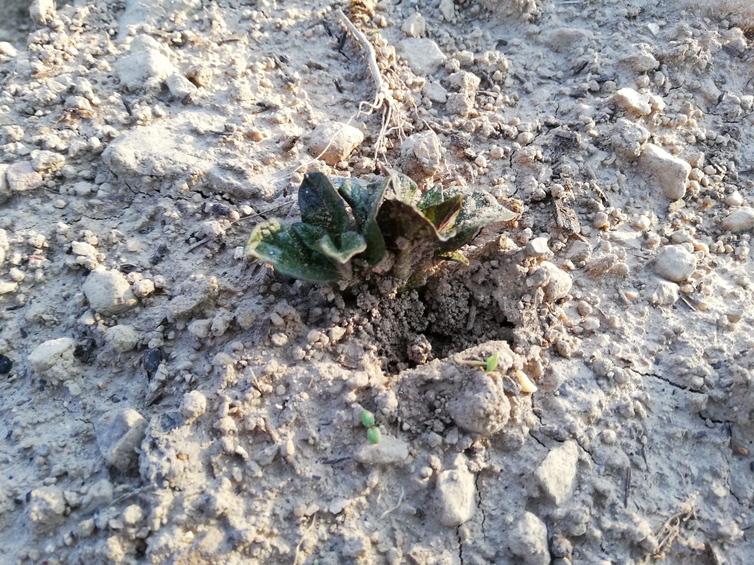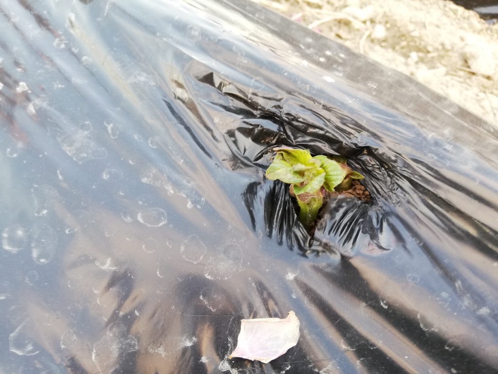 ジャガイモの芽が出ました 農作業 Twitter Facebook LINE 2020.04.05 ジャガイモの芽が出ました。マルチが浮いていたので穴を開けたら芽が出ていました。マルチなしも良く見ると2つ出ていました