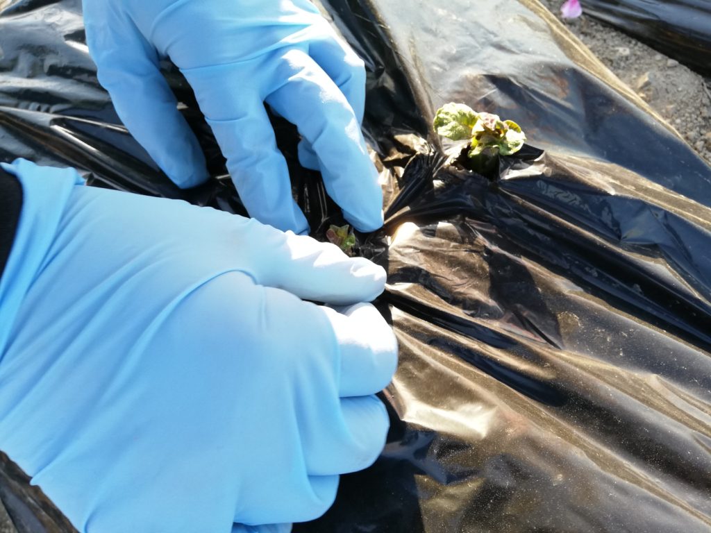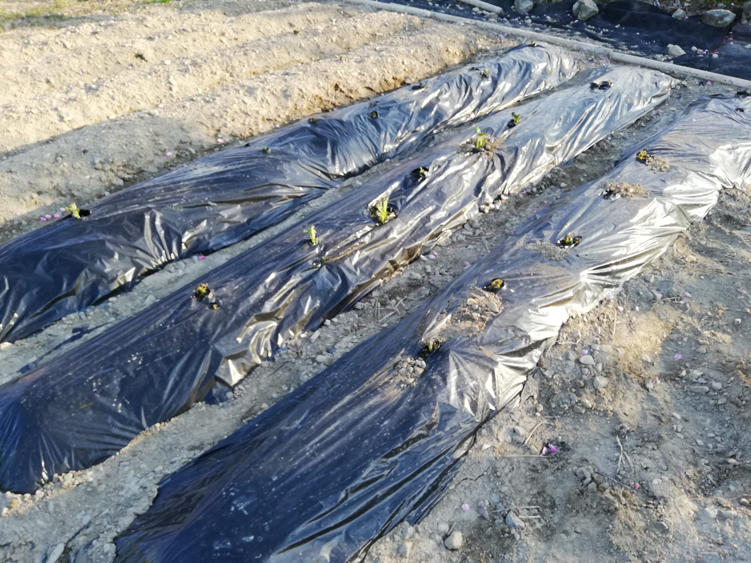 ジャガイモのマルチを破って芽を出す作業です。ほとんど出ていましたが、出ていないところも。こらから出るのかな?